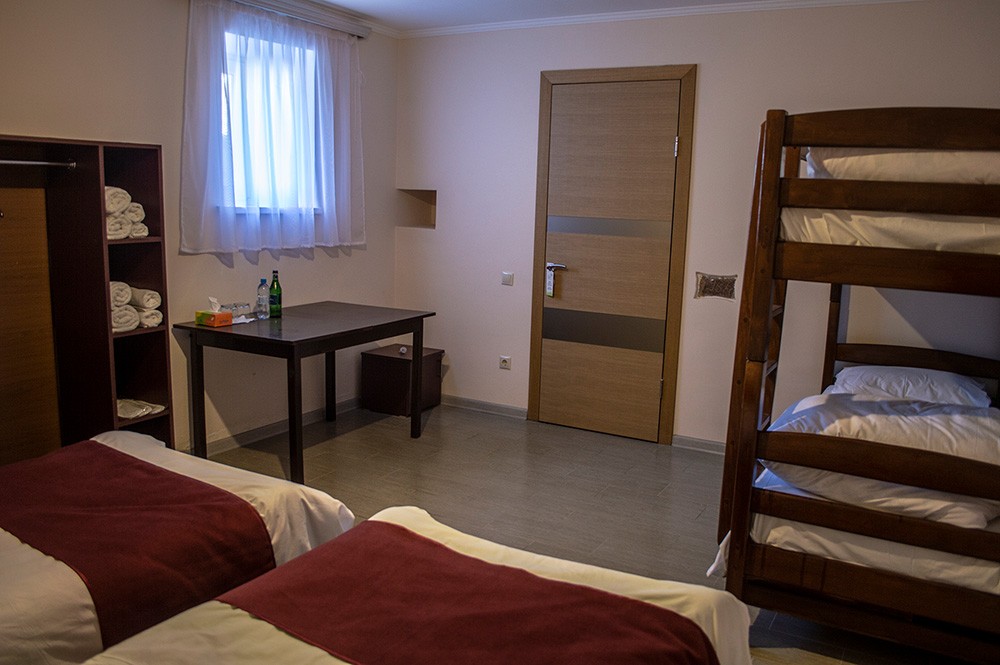 This is a large quadruple room, located on the first floor of Stone Art Guest House. It features two separate single beds (or one king size bed) and one bunk bed, extra bed is available upon request. Equipped with a wardrobe, a table, chairs, Room: Ani may accommodate 5 people.